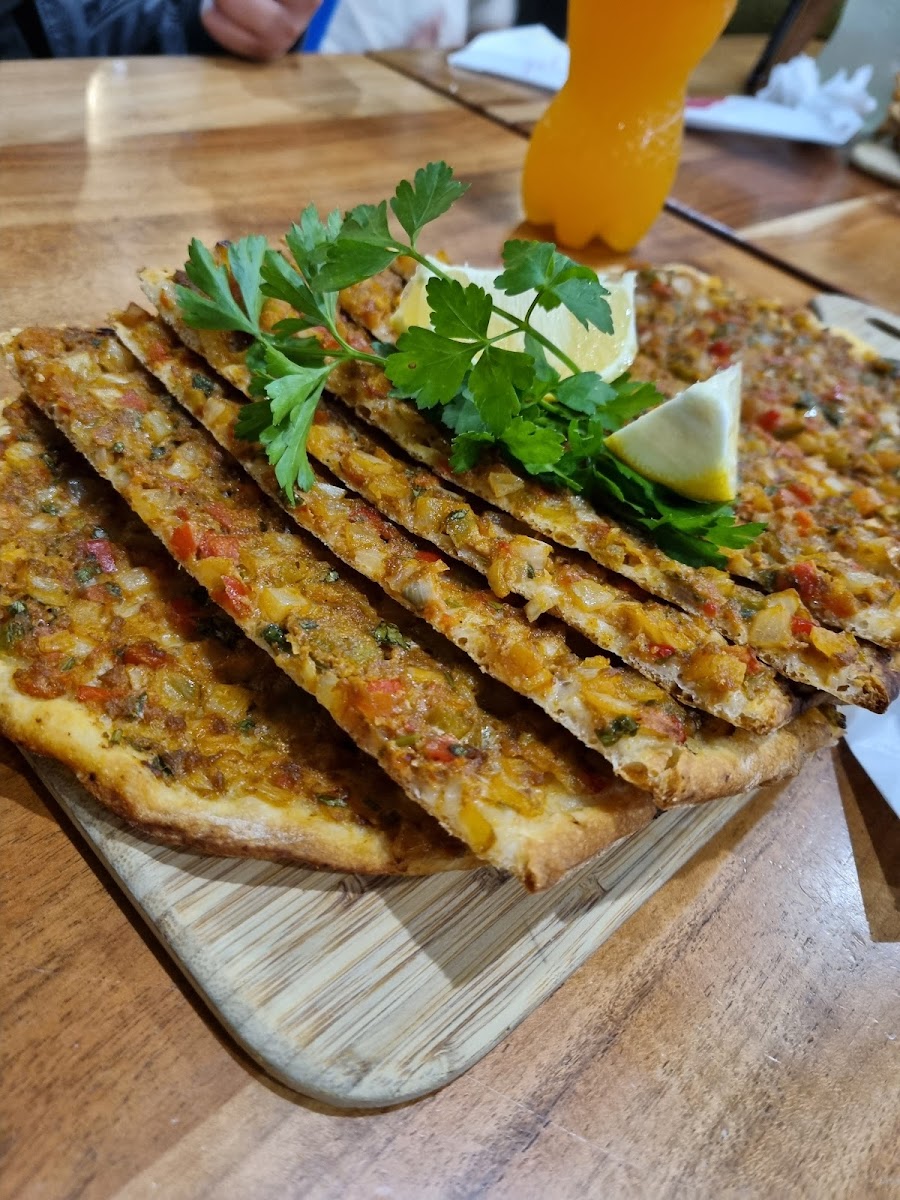 Lahmacun, often described as Turkish pizza, is thin, crisp, and well-seasoned. It works perfectly as a quick meal or a shared starter.